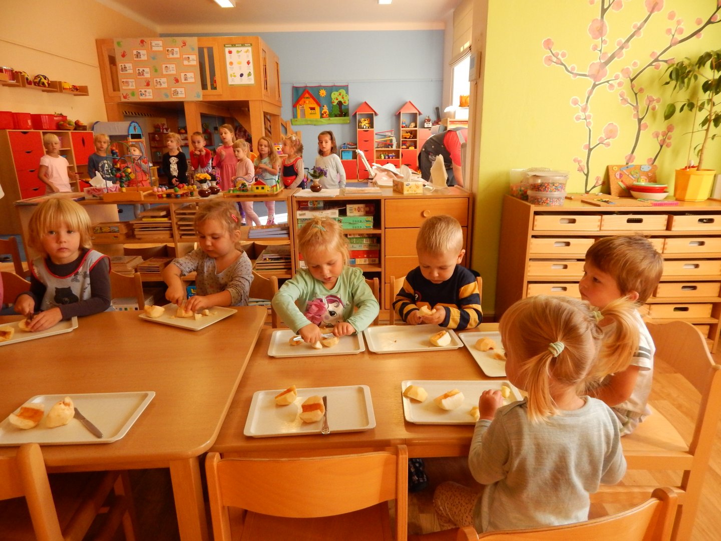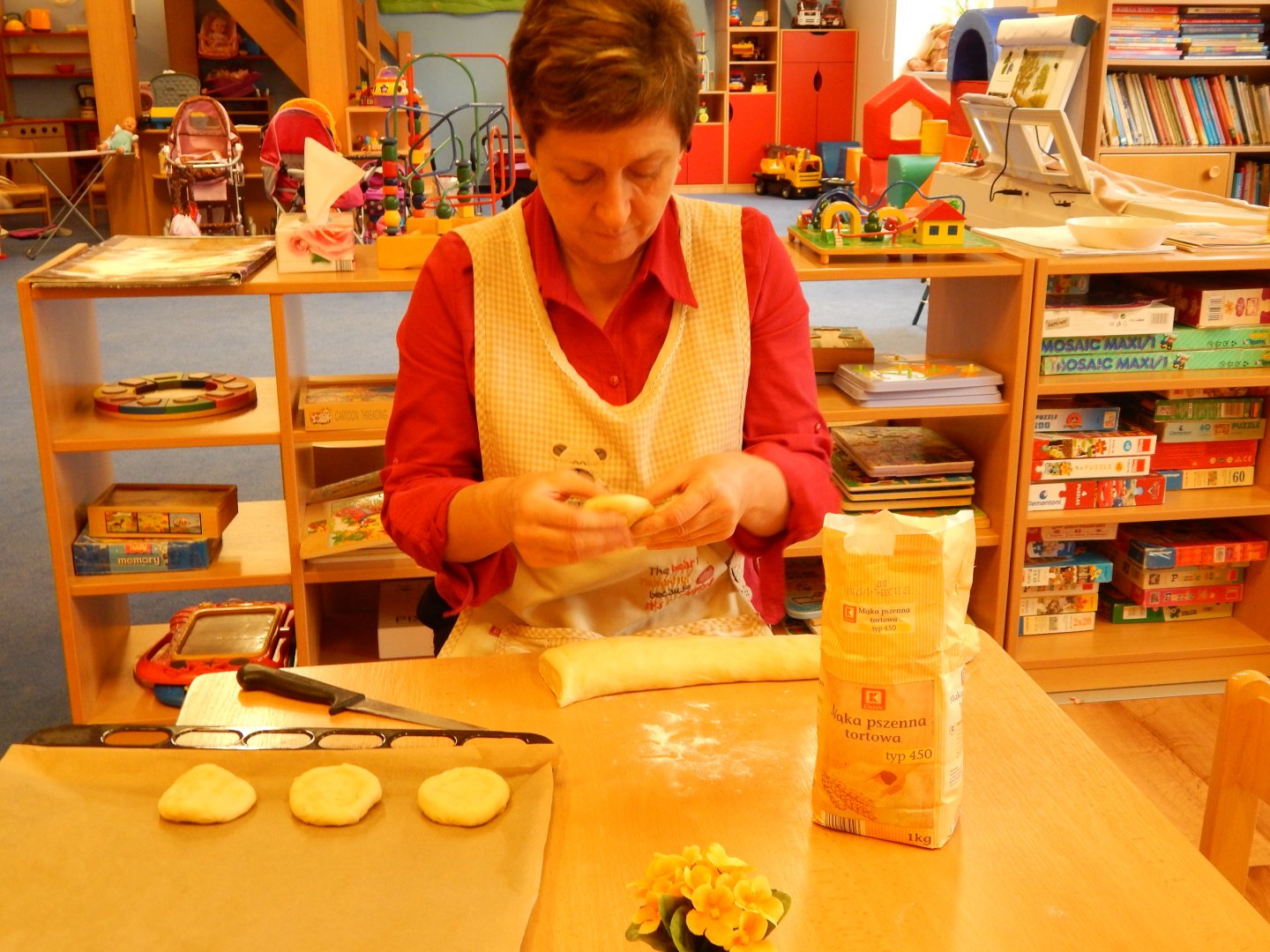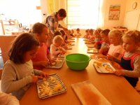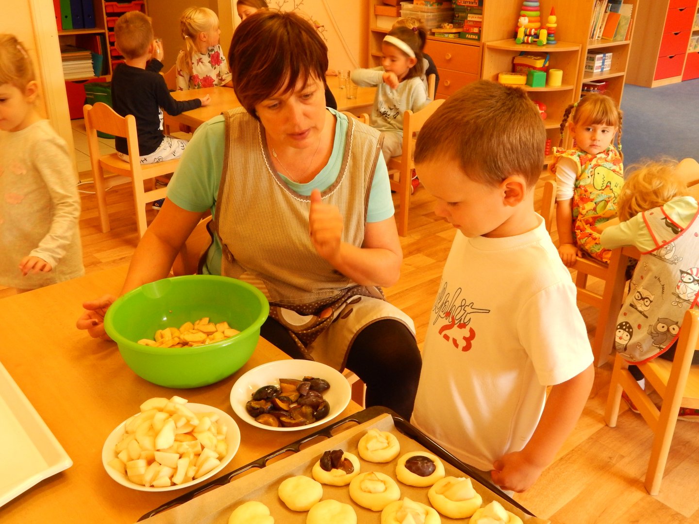 Pani Gosia wyjaśnia dzieciom, jak ułożyć owoce na kołaczyku.